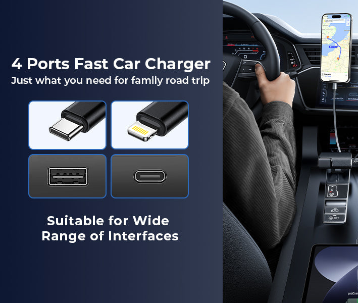 شاحن سيارة سريع وأنيق 4 في 1 - منافذ من النوع C، وiPhone، وUSB-A، وUSB-C - 120 واط بجودة ممتازة